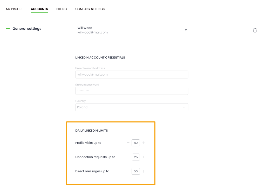 You can change these limits in Woodpecker by clicking on the settings icon next to the LinkedIn account name. In the General Settings of your account, you'll find the 'Daily LinkedIn limits' section, where you can change how many profile visits, connection requests, or direct messages your account can perform.