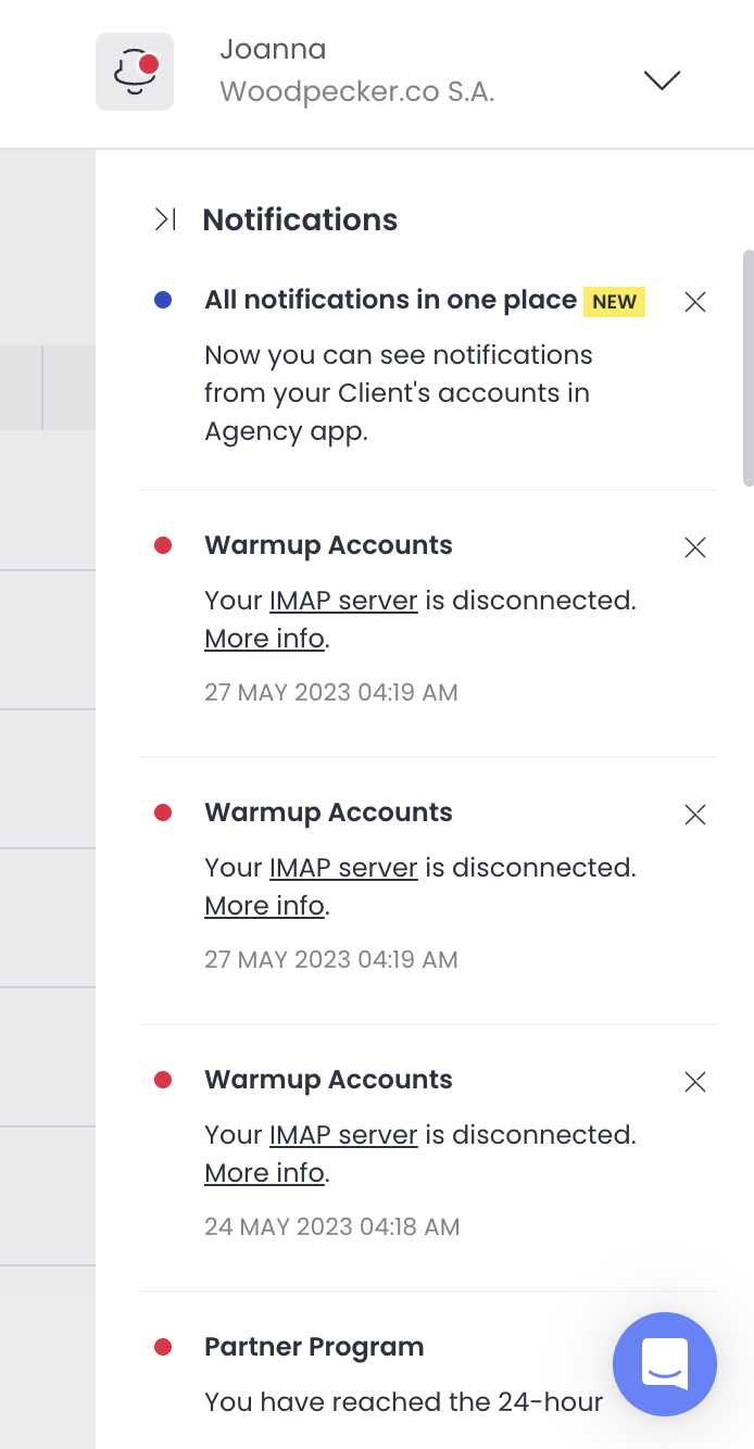 The notifications bell with all messages from all accounts you have access to is now available in the Agency panel. Read more about notifications in Agency panel here »
