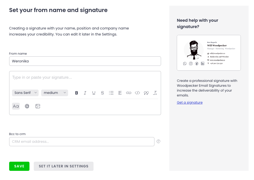 This screen allows you to set the sender's name that will be visible to your recipients, and a signature that will be attached to emails in your campaigns.
