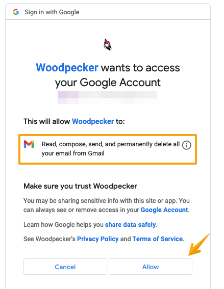 Once you click Add email, you will be asked to allow Woodpecker to access your Google Account and read, send, delete as well as manage your email.