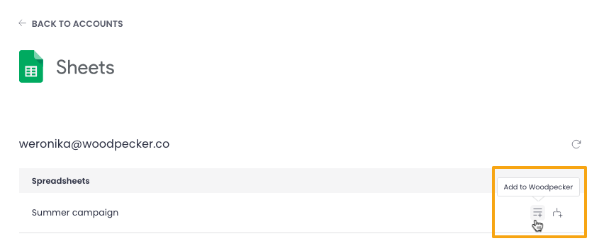 If you want to choose a specific worksheet from your file, you can do so by clicking on the "Add to Woodpecker" icon next to the name of your Spreadsheet.