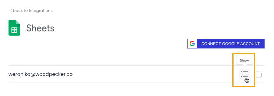 After connecting with your Google Account, click on the “Show” icon next to your login. You’ll see all the spreadsheets that Woodpecker was able to find and from which you can import prospects.