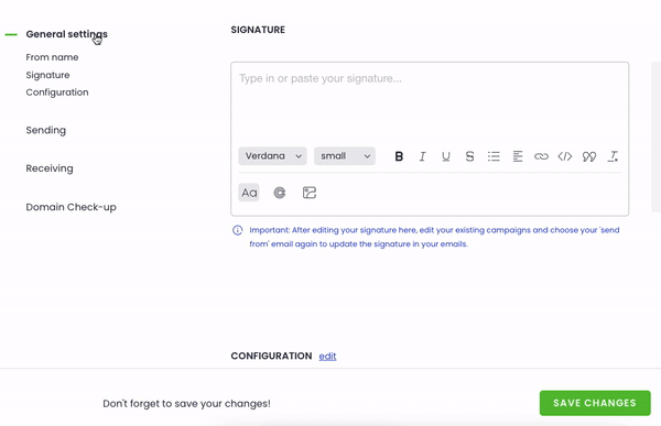 My email doesn't show a signature – Please update your signature in the mailbox settings, and make sure the "Use sender's signature" option is selected in your campaign.