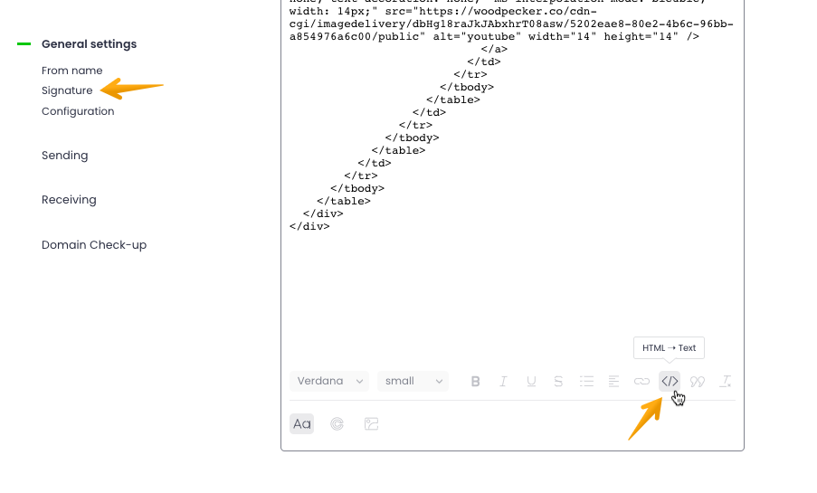 Where can I enter the HTML code of the email template? I can't find it anymore – Go to "Settings" → "Email Accounts", select your mailbox, and open Signature settings. Click the icon </> to switch from Text view to HTML view.