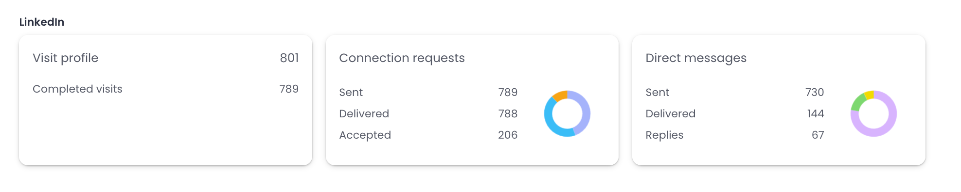 In the infographic, you'll see stats divided into two (or three if there are LinkedIn tasks included) sections: General and Email. Each section has a visual representation of those stats in the form of graphs.