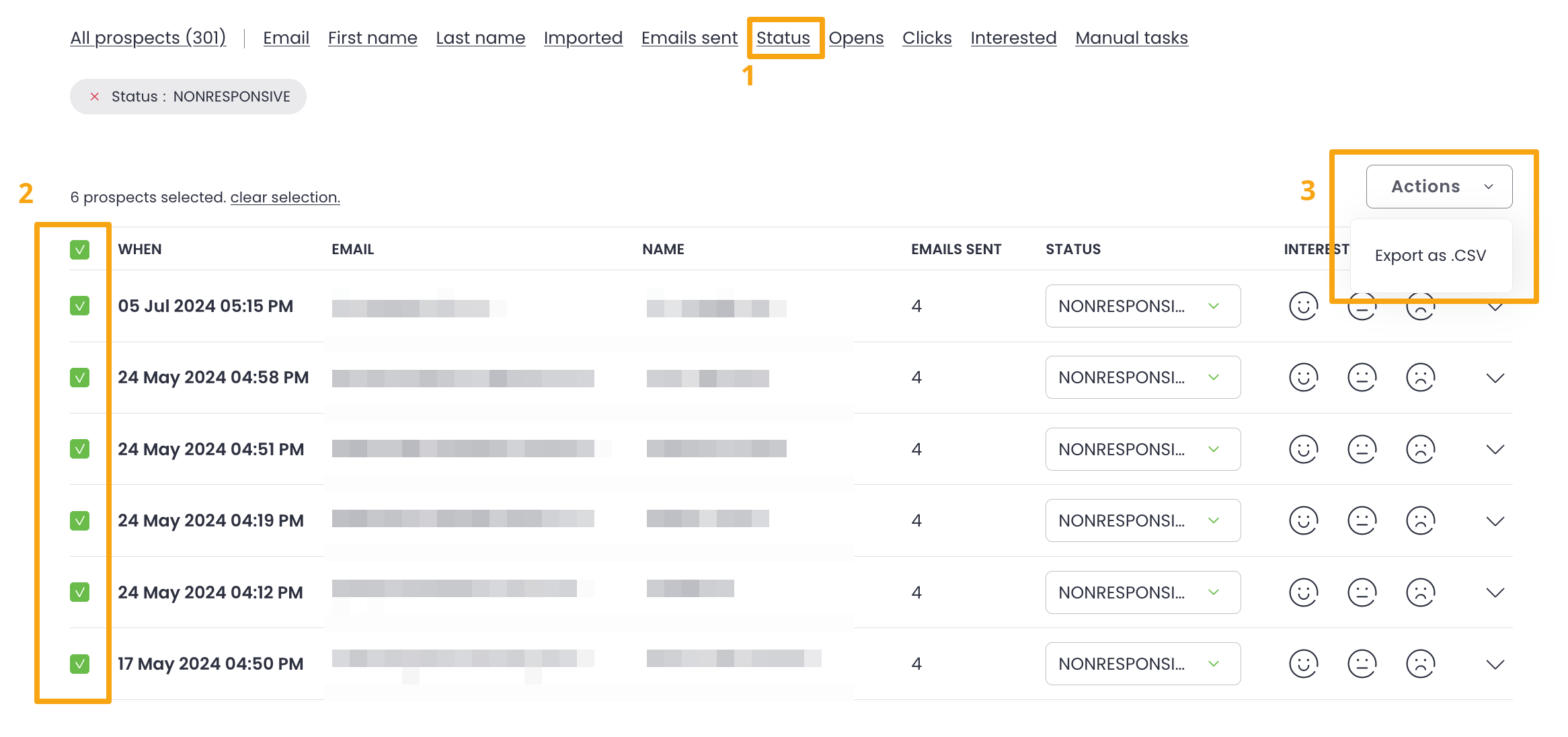 Yes, first, look up the prospects with NONRESPONSIVE status (1.). Secondly, checkmark the ones which you want to download (2). Thirdly, click 'Actions' (3.) → 'Export as .csv' (4.)