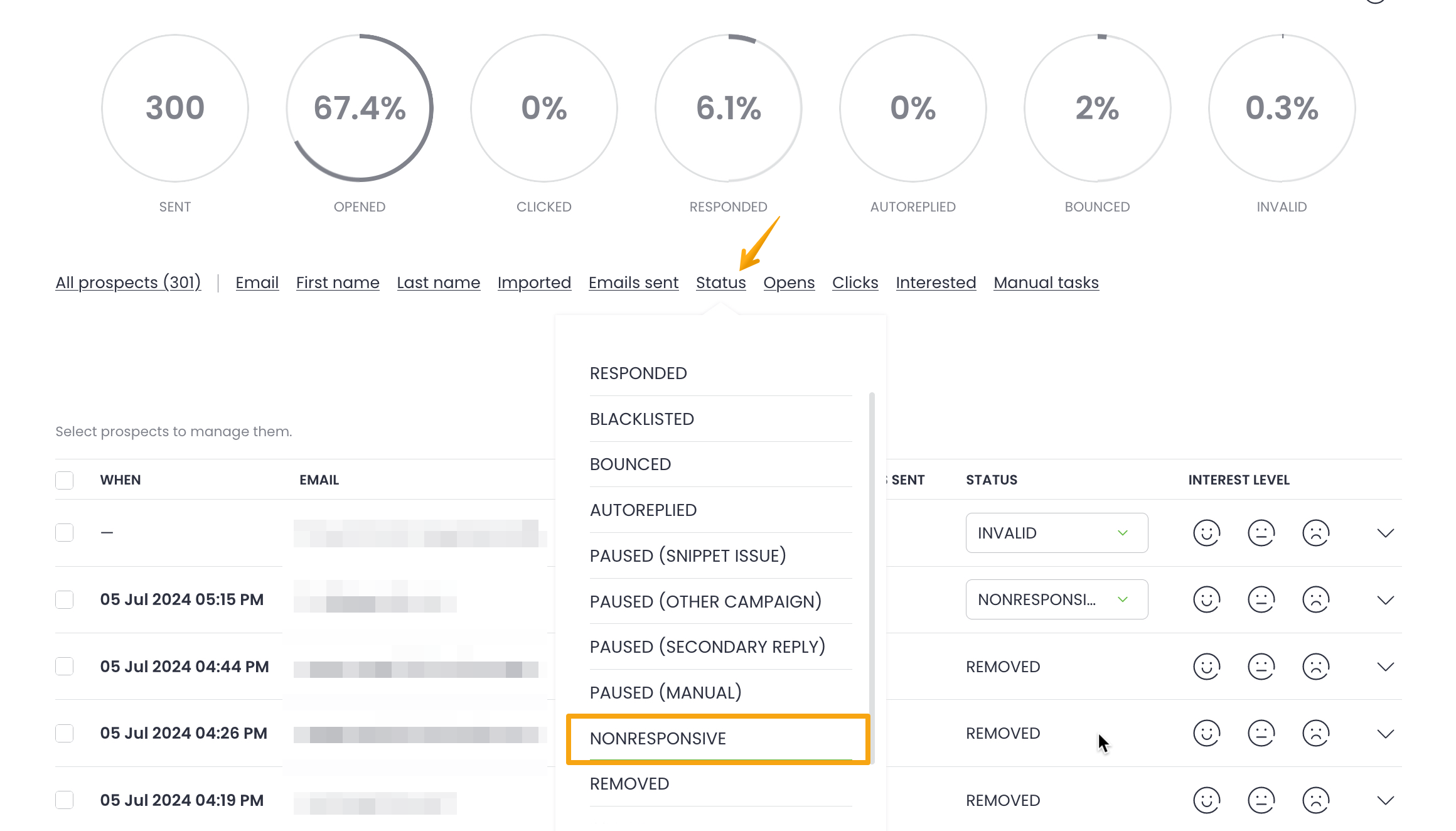 First, open your campaign and click 'Edit.' Then, scroll down to the PROSPECTS section. Finally, filter your contacts by 'Status' → NONRESPONSIVE.