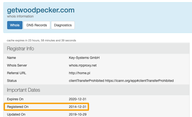 Alternatively, you can use Cisco Talos or any other domain age checker. In the example below, we used our domain getwoodpecker.com.