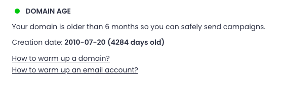When you see a green icon next to the "Domain age", it's a sign that it's safe for you to run campaigns from this domain.