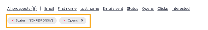 For the first filter, choose “Opens: 0”. Keep in mind that you should only use this filter when you are sure that you had the Open tracking enabled and that these prospects did not open your emails.