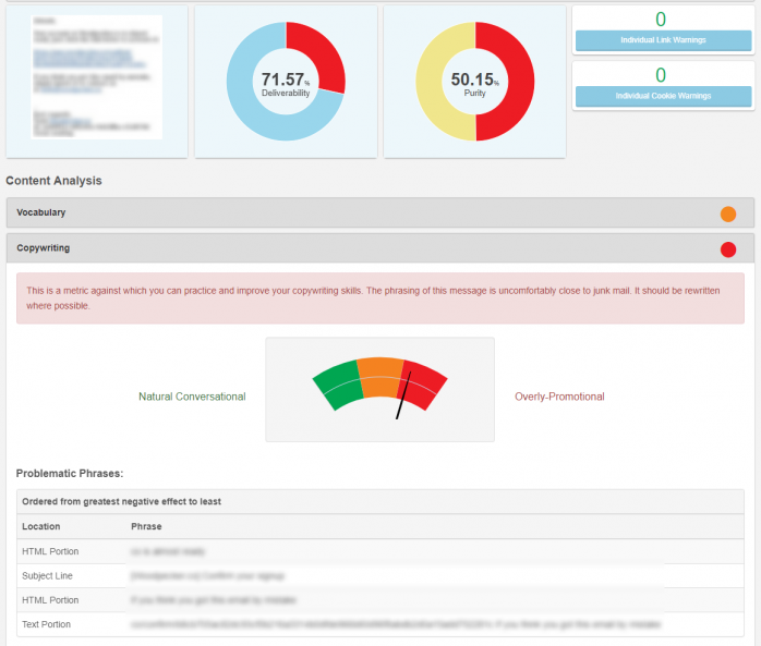 The tool shows quite a lot of data so it will be helpful to more advanced and tech-savvy users. On the other hand, the less advanced users can benefit from the general deliverability assessment expressed in percentage (the Deliverability column of the dashboard). I think all users, regardless of the level of technical proficiency, will enjoy the feature of message content analysis. SendForensics performs an assessment of your email content and displays a result on a scale from ‘natural conversational’ to ‘overly-promotional’. It will also point to the specific phrases in your copy which may alert anti-spam filters and decrease your delivery rate.