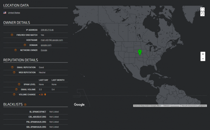 Then, it will show you if your web reputation and email reputation are assessed as good, neutral or poor by other email service providers. You should obviously aim at good. Neutral is a sign that there’s something to improve. Poor means that most of your emails probably won’t get to their destination. Additionally, you can see if your email volume hasn’t changed too much over the past (you should avoid peaks in the volume of the sent emails). Plus, you’ll get informed in case you’ve been listed on a major blacklist.