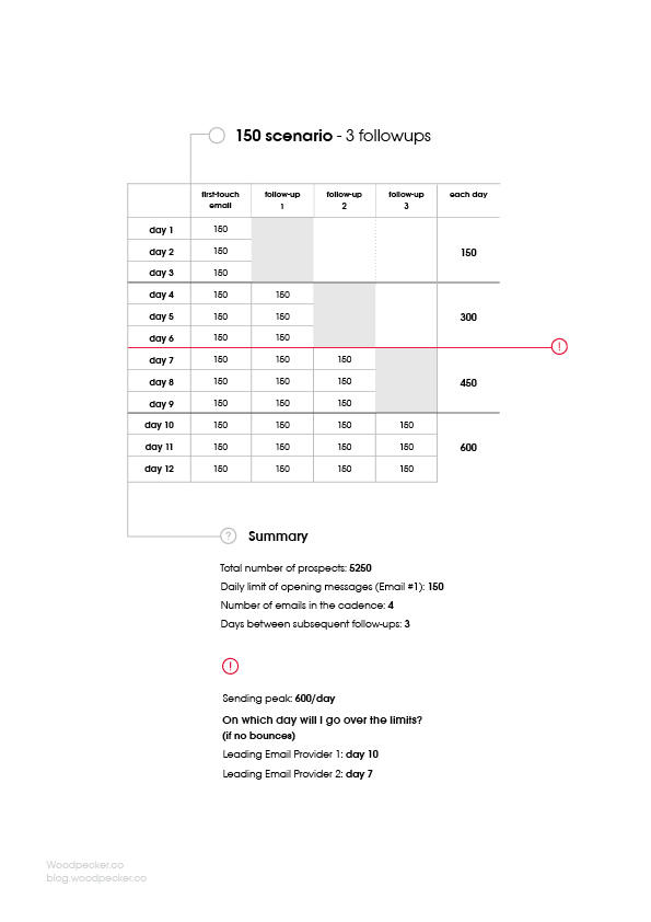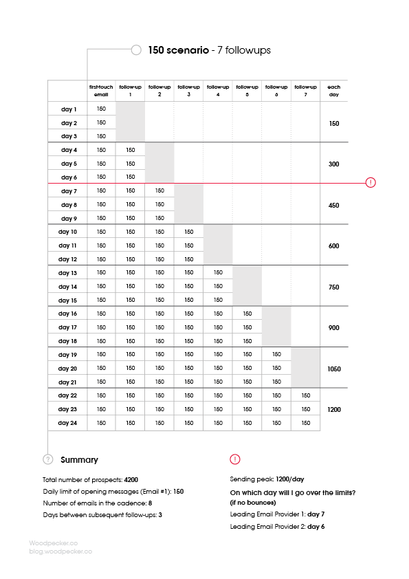 #3) If you have a lot of messages to send (numerous prospects and campaigns with multiple follow-ups) you should schedule a smaller number of messages to be sent a day. We’ve prepared a few tables presenting various sending simulation scenarios. They are meant to help you predict on which day of your campaign you may accidentally exceed your email host’s sending limits.