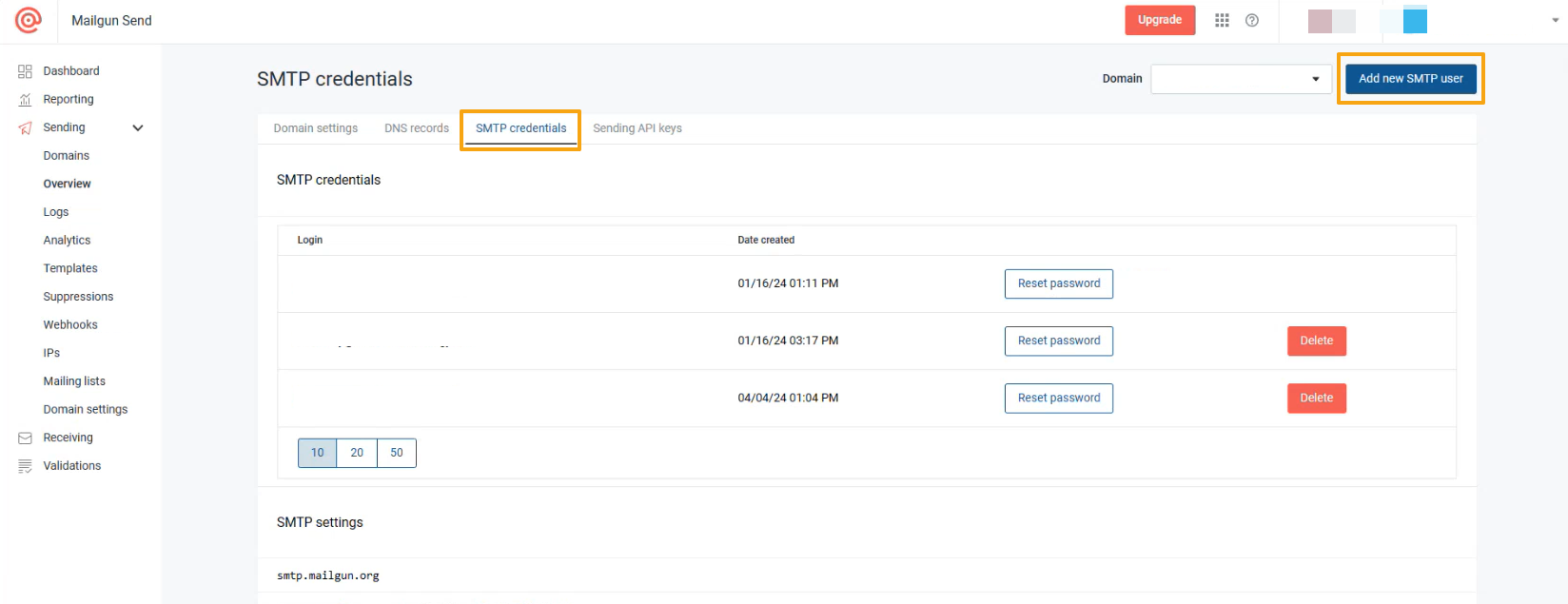 In the SMTP Credentials tab, click on the “Add new SMTP user” button and input your credentials as needed.