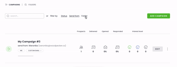 Campaigns created by sending a single email will be added to a folder CUSTOM EMAIL. If you change this folder’s name, Woodpecker will create a new one, also called CUSTOM EMAIL, and assign a new campaign to that folder.