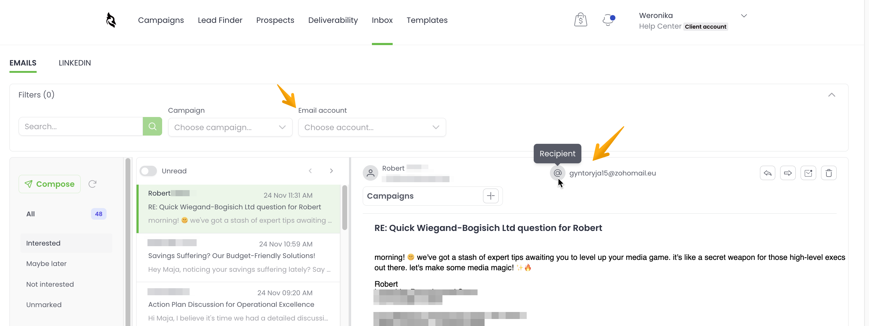 Centralized Inbox collects messages from all mailboxes connected to a Woodpecker account. In the preview of a message, you'll see who this email refers to next to the "Recipient" icon.
