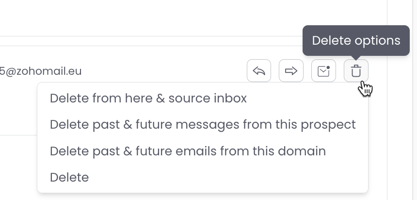 Delete all past and future emails from this prospect from here - deletes all emails from this prospect and prevent any future emails you might get from them from appearing in Woodpecker Inbox. They will still come to the inbox on your email server.