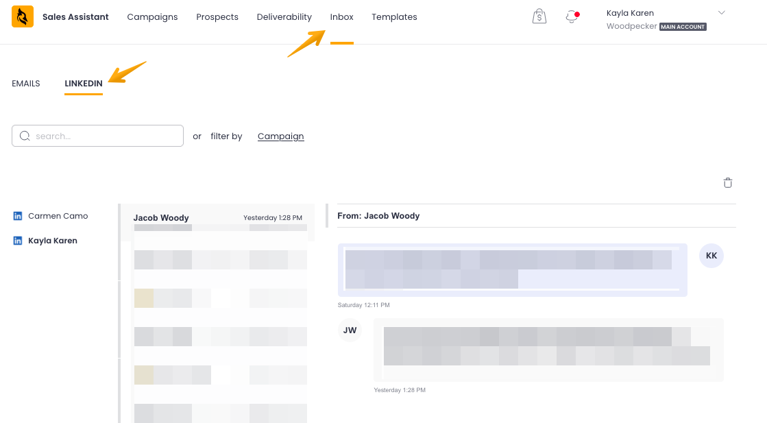 Click on the Inbox at the top of the page and then on the "LinkedIn" tab. All LinkedIn accounts connected to Woodpecker will be visible on the left, and after clicking on each, you'll see the conversations from LinkedIn where a prospect replied to you.