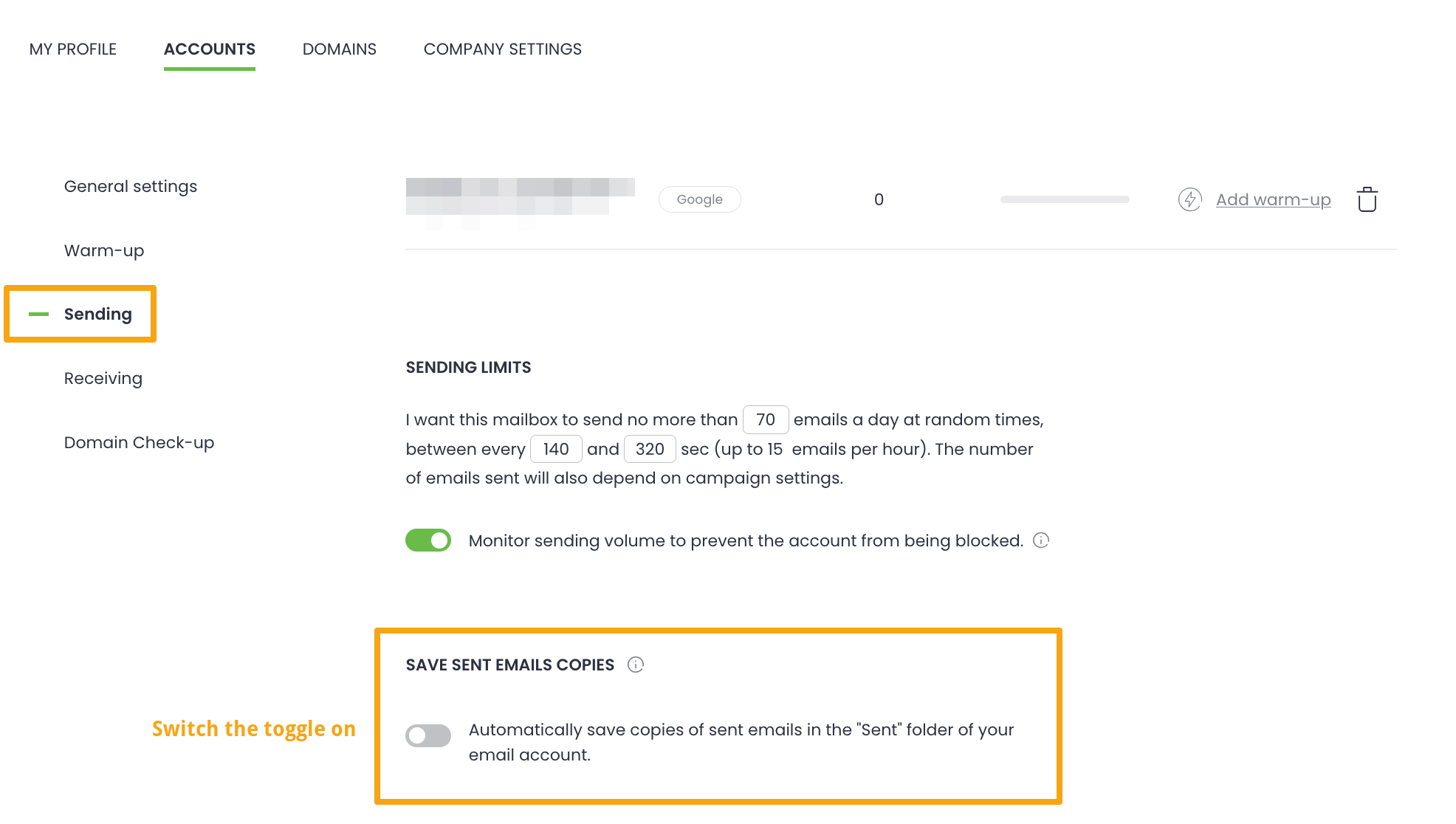 You can also choose to save copies of sent emails in your main mailbox (on your email provider's side). To do so, head to your account's settings and choose the email account from which you're sending the campaign.