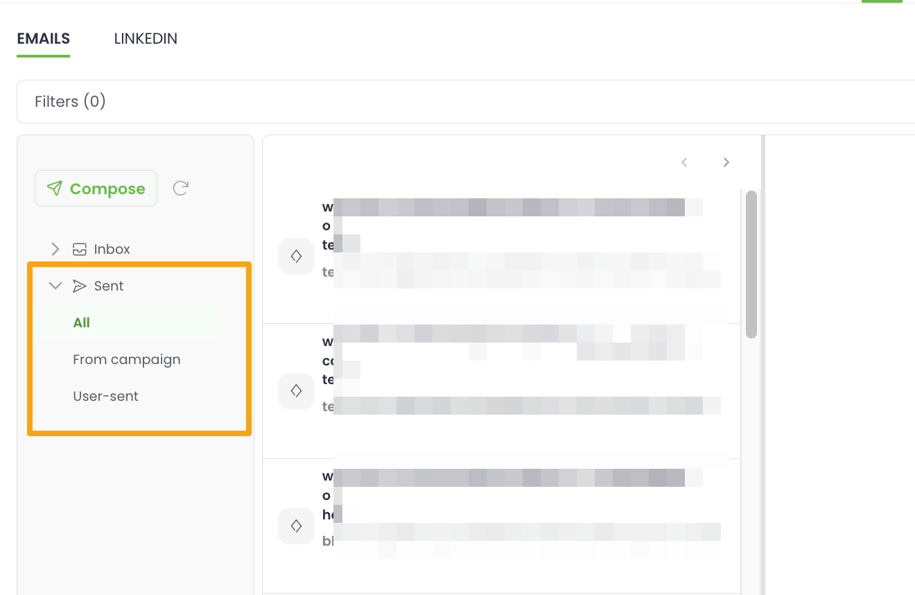 You can see your sent emails in Woodpecker under the "Sent" folder. You can sort them by all messages, those from the campaign, or those sent separately by users – the last option is the most convenient way to view messages you've sent from your inboxes in response to your prospects.