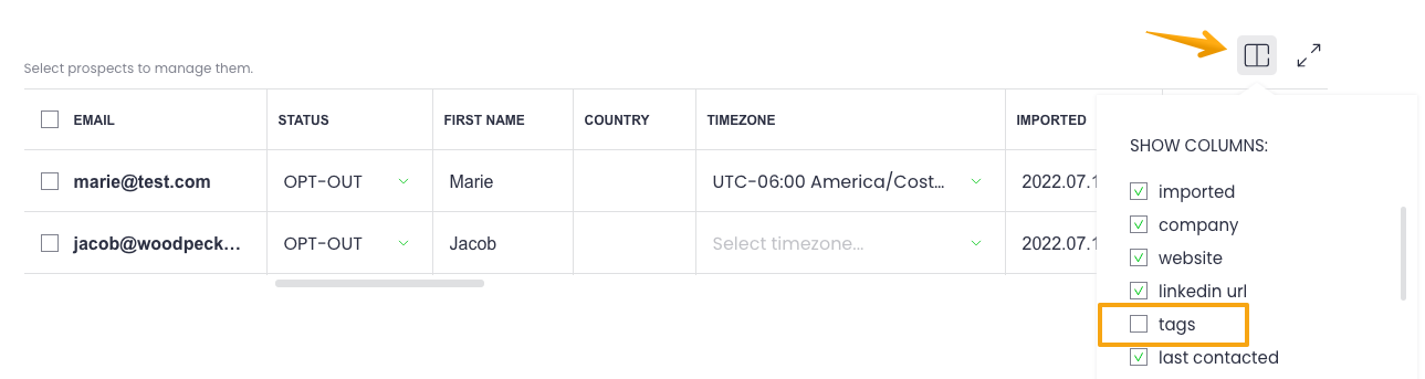 Q.: You can see the list of prospects but can’t find the 'TAGS' column?