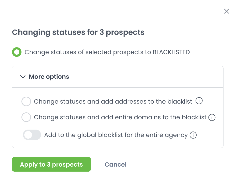5. A window will pop up with more options to this action – you can choose to change the status and add prospects to the blacklist at the same time, or add entire domains to the blacklist.