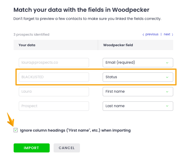 4. Match the columns from the CSV or Excel file with those in Woodpecker.