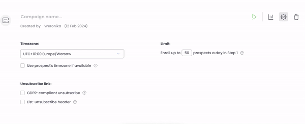 You can enable the option to do so directly in the campaign edit mode in Woodpecker. Click on the gear icon at the top right of the page to open the campaign's settings. Under the “Unsubscribe link,” section, checkmark the “List-unsubscribe header” box.