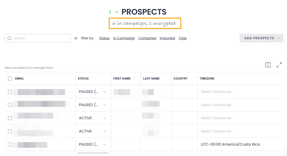 encrypted prospect in the Prospects tab in Campaign