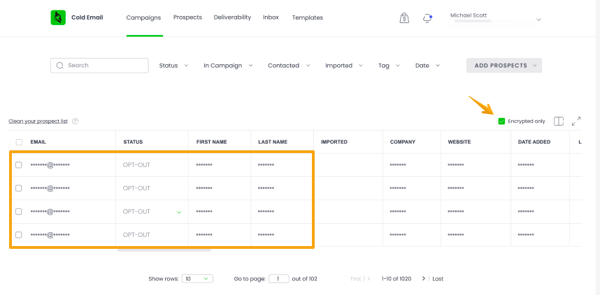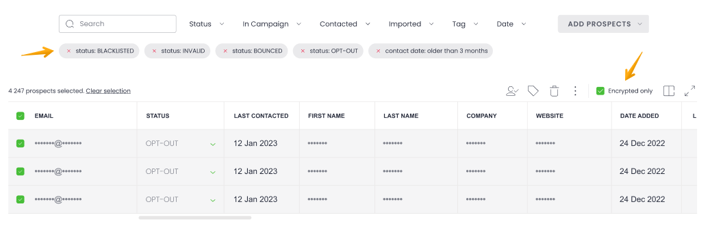 After clicking on the "Clean your prospects list" option, the ones GDPR-encrypted will fall under the search, as they have the OPT-OUT status assigned. To filter them out, check the "Encrypted only" box again.