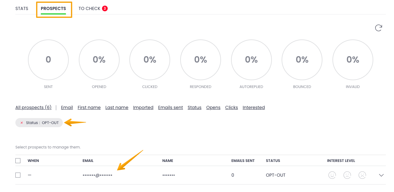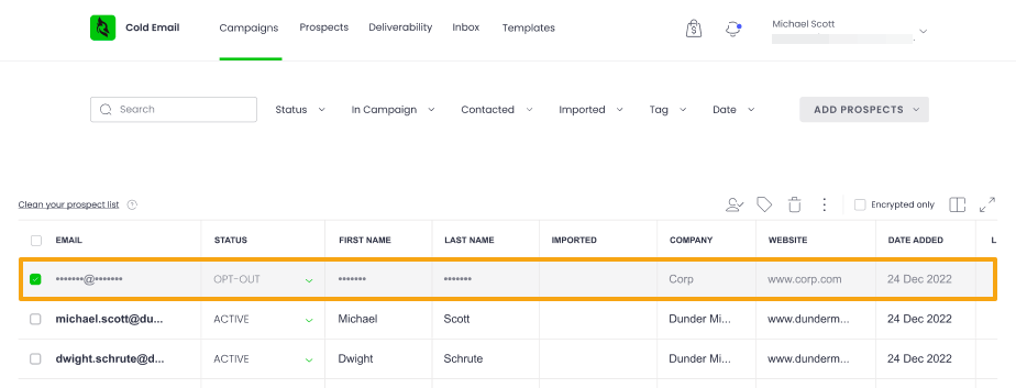 You'll see that the status of the GDPR-encrypted prospects will change to OPT-OUT – that's the sign their data was erased from our database. This way, Woodpecker helps you avoid contacting these prospects ever again.