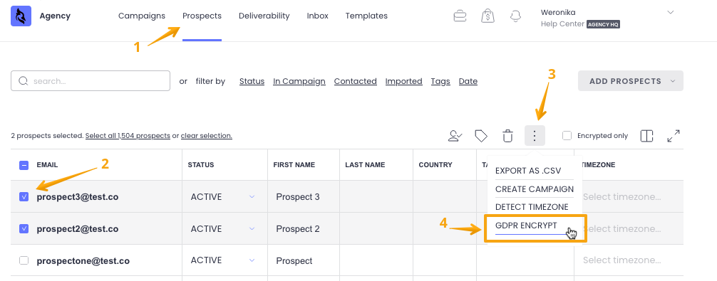 Prospects tab with the option to GDPR encrypt chosen prospect