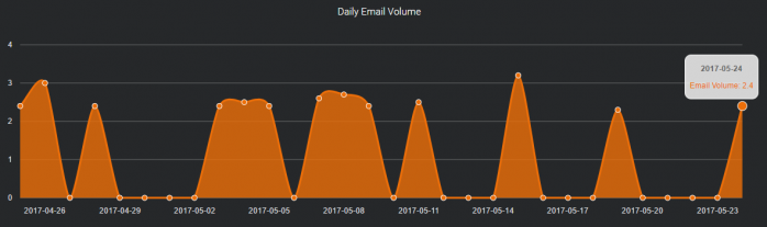 #1 AVOID: This is how your mailbox activity looks like when you try to send all your campaigns during a two-hour or so time period one day, and you’re not sending anything at all on other days.