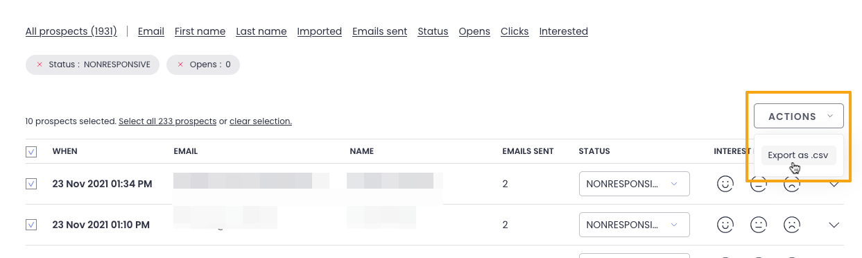 After you’ve done that, an “Actions” button should appear, and by clicking on it, you will be able to export the prospects to a .CSV file.