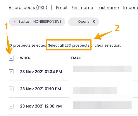 When your list of prospects is filtered, you can move on to selecting them by check-marking the box at the top of the table on the left.