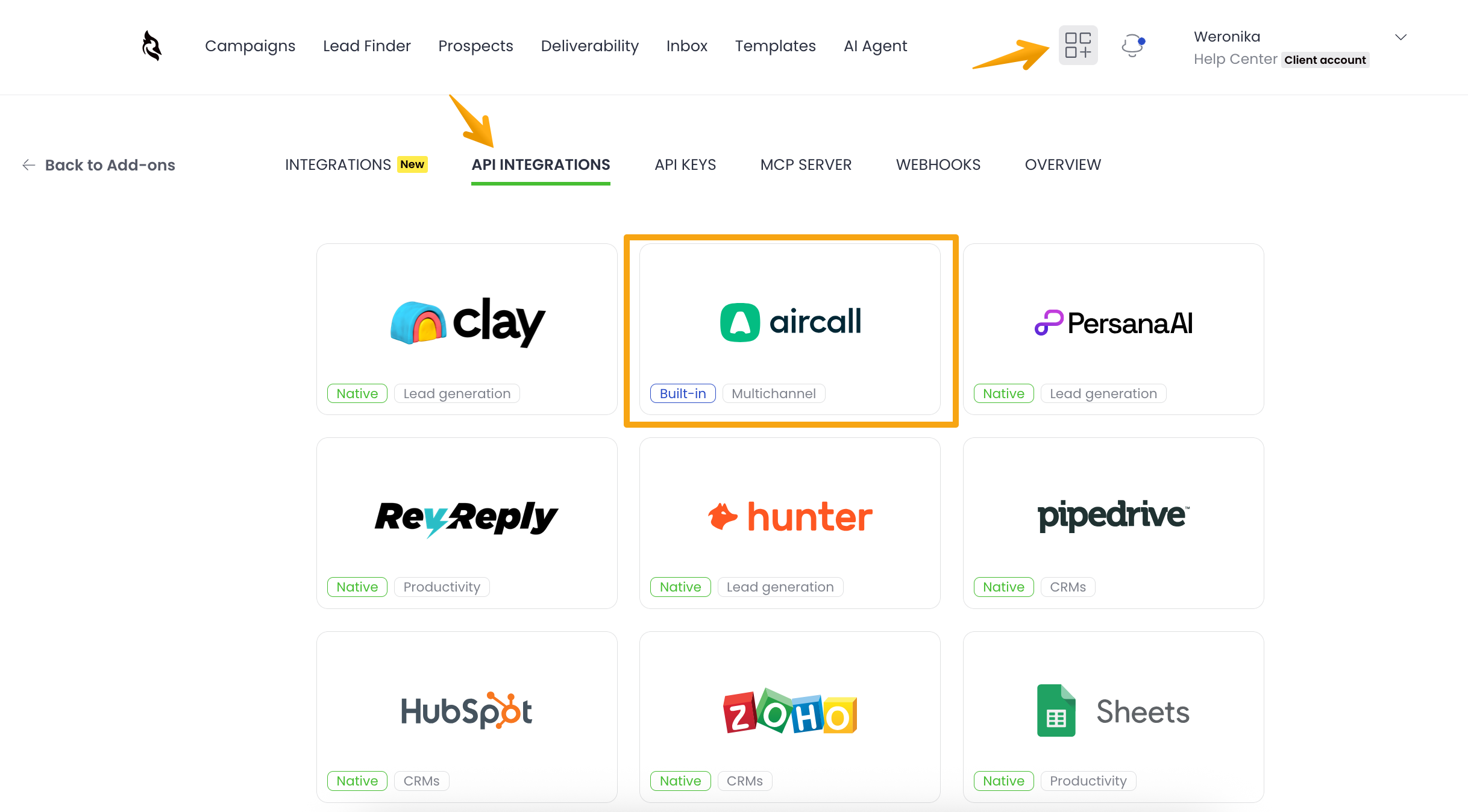 Head to the Add-ons tab → API & Integrations → API Integrations, and find Aircall. Click on the button to enable the integration.
