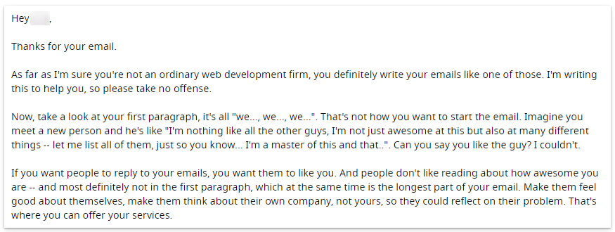 Moreover, I replied to this email. I wanted them to realize that this is NOT what they want to keep sending to people. Here’s just the beginning of my response regarding the introduction, as that’s what we are focusing on.