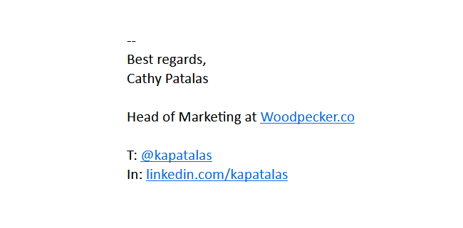 • Be attentive to technical details like html structure – a poorly coded signature may not only render poorly to your email recipients, but it may also negatively affect your email deliverability. If you’re about to decide between a fancy-looking signature and a simple text signature, go for the second one. If you’re going to use html, have it prepared by a developer or use an email signature generator that will help you create a deliverability-friendly signature, like the Woodpecker one.