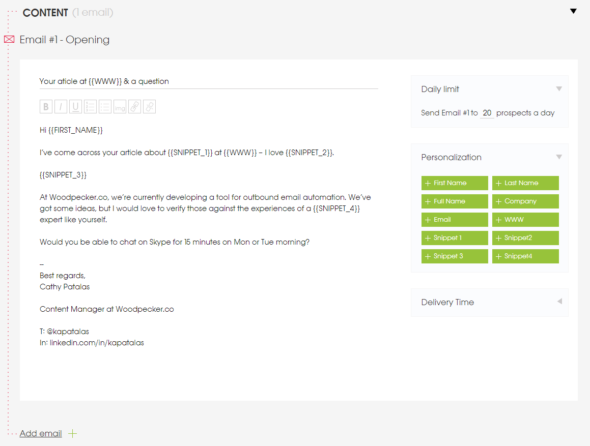 Note that in this post I described the process of automating a single-email outreach. But keep in mind that you should always follow-up. Woodpecker will gladly take over sending the follow-ups for you as well – and that’s the toughest part to handle manually, believe me.