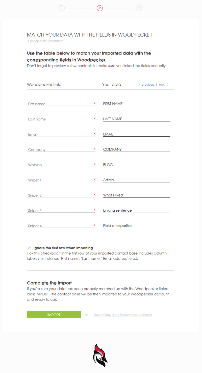 Given the file, Woodpecker will ask us which columns from our database should represent the corresponding custom fields in our message. Sounds a bit complicated, but in fact it’s easy. Just take a look below how I matched the fields.