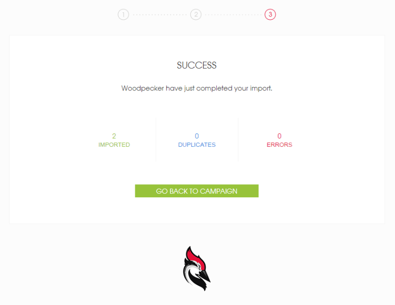 In the next step, we just confirm the import and Woodpecker will show us how many contacts have been imported successfully, right next to the number of dupliates and errors. Mine was a tiny import indeed, so Woodpecker just gulped it within a second.