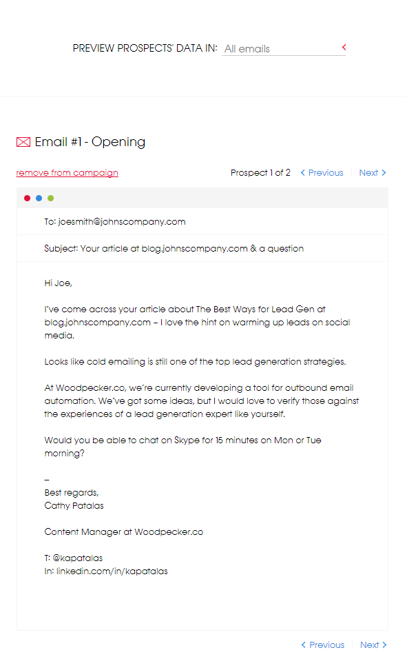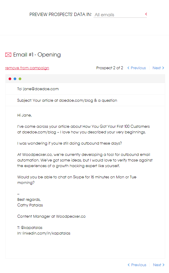 I used the very same template for the email to both of my made-up prospects, remember? Do these two look like automated bulk emails sent to thousands of people at once?