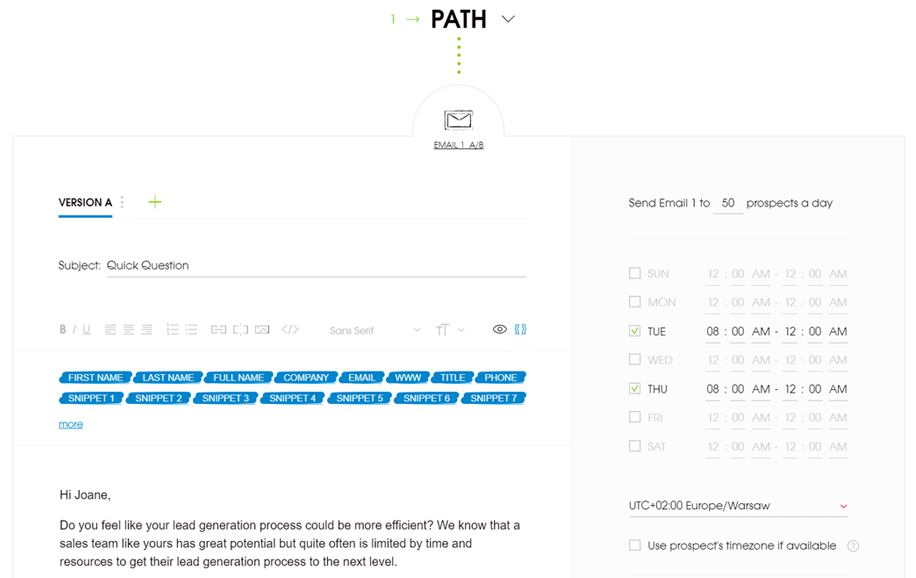 If you’d like to A/B test different versions of a follow-up you can do it as well. The idea remains the same. You can create up to five different versions of a follow-up email in each Path (If-campaigns let you split your campaign into two sequences, called Paths, depending on whether a prospect opened your email or clicked a link in the copy – learn more about it here)