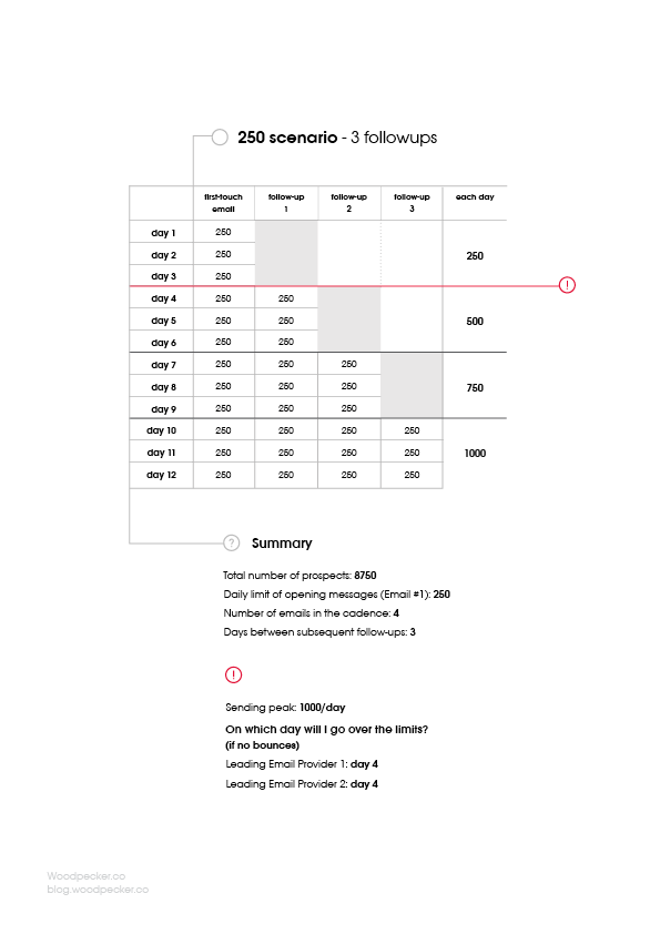 Mind you that in these tables we didn’t consider any replies (if a prospect replies to you, Woodpecker automatically stops sending the subsequent follow-ups planned for this person). So in fact, the number of follow-ups planned to be sent will decrease as your recipients reply to you. But regardless of that, it’s safe to use those tables as a helpful resource when scheduling the daily number of opening emails to be sent, in regard to the number of follow-ups your campaign includes.